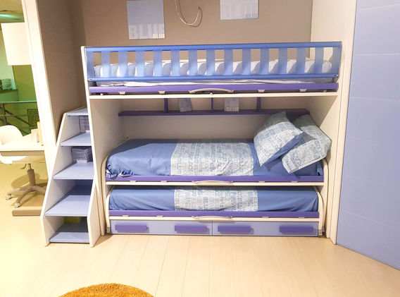 Cameretta Moretti Compact in finitura laccata, con due letti scorrevoli ed un letto a soppalco dotato di meccanismo di ribassamento per facilitare il rifacimento del letto.